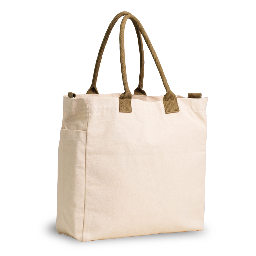 Reuse this unlaminated cotton 410 gsm adjustable double strap tote again and again to cart groceries, library books or farmer’s market finds. Choose from several vibrant trim colours to accent the natural canvas exterior.